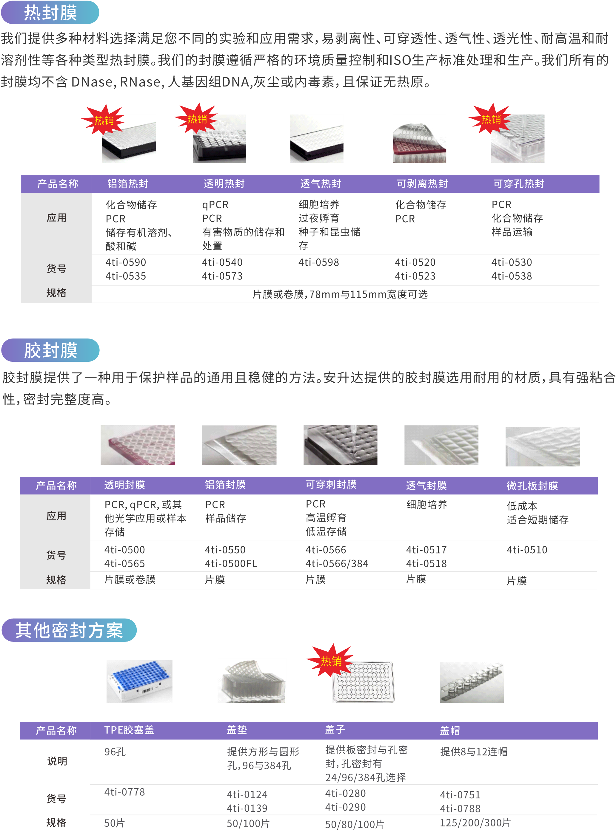 我們提供多種材料選擇滿足您不同的實(shí)驗(yàn)和應(yīng)用需求,易剝離性、可穿透性、透氣性、透光性、耐高溫和耐溶劑性等各種類型熱封膜。我們的封膜遵循嚴(yán)格的環(huán)境質(zhì)量控制和ISO生產(chǎn)標(biāo)準(zhǔn)處理和生產(chǎn)。我們所有的封膜均不含DNase,RNase,人基因組DNA,灰塵或內(nèi)毒素,且保證無熱原。